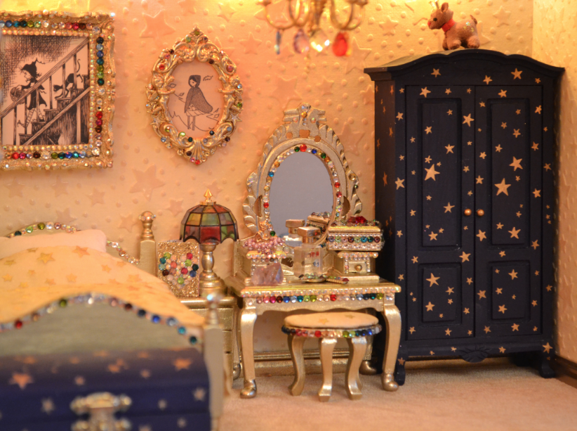 The dressing table is Celestine' favourite thing in her bedroom. Being a little bit vain, she loves to sit in front of it and bat her eyelashes in front of the mirror. She also loves that it is the place for her jewellery box, keeping all her precious jewels safe. Her lucky, gold Cornish pisky is sitting on the left side of her dressing table, surrounded by her birthday necklace which she likes to have on display.