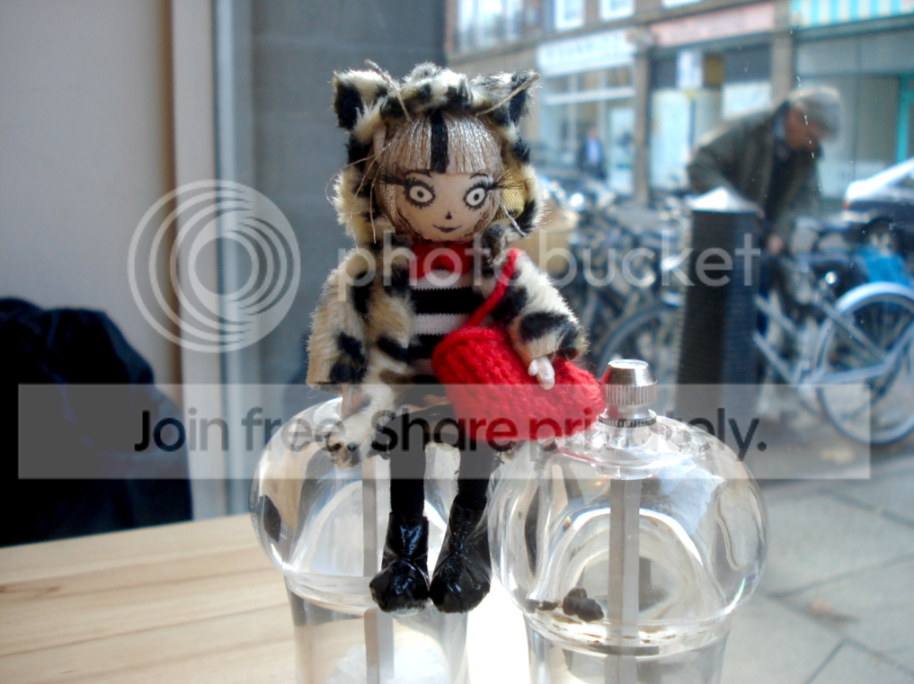 And here's Celestine (channeling some French vibes!) sitting on top of some salt and pepper pots yesterday. I took a little trip to visit my friend and we went to this nice little cafe place for lunch. They had some really nice food there- sweet potato gratin, chocolate truffle tart  (yum) lamb wrap with hummus etc... it's making me hungry thinking about it all.  I was lovely to see my friend and we had an interesting conversation about being passionate about stuff but that's a topic for another post!